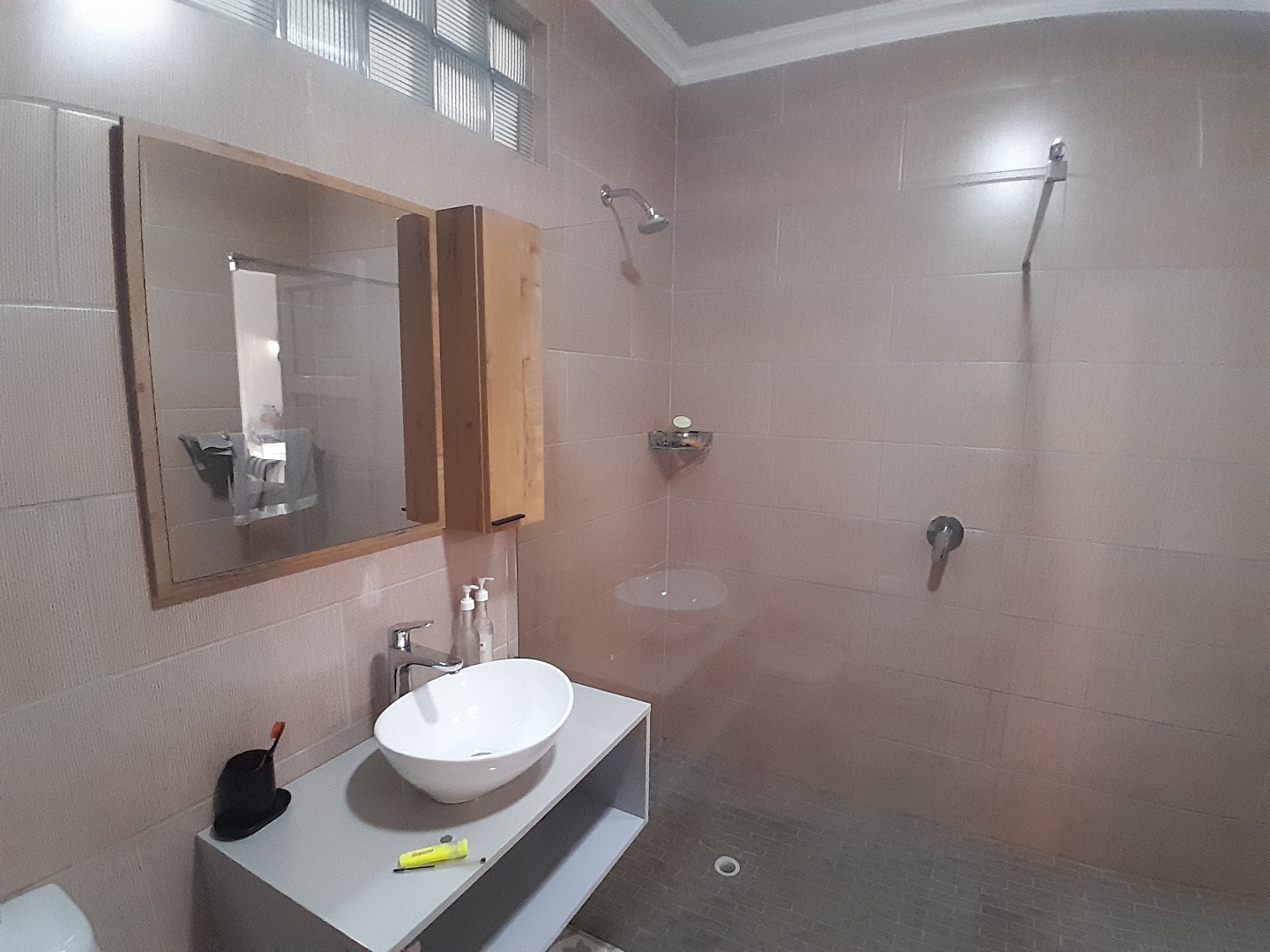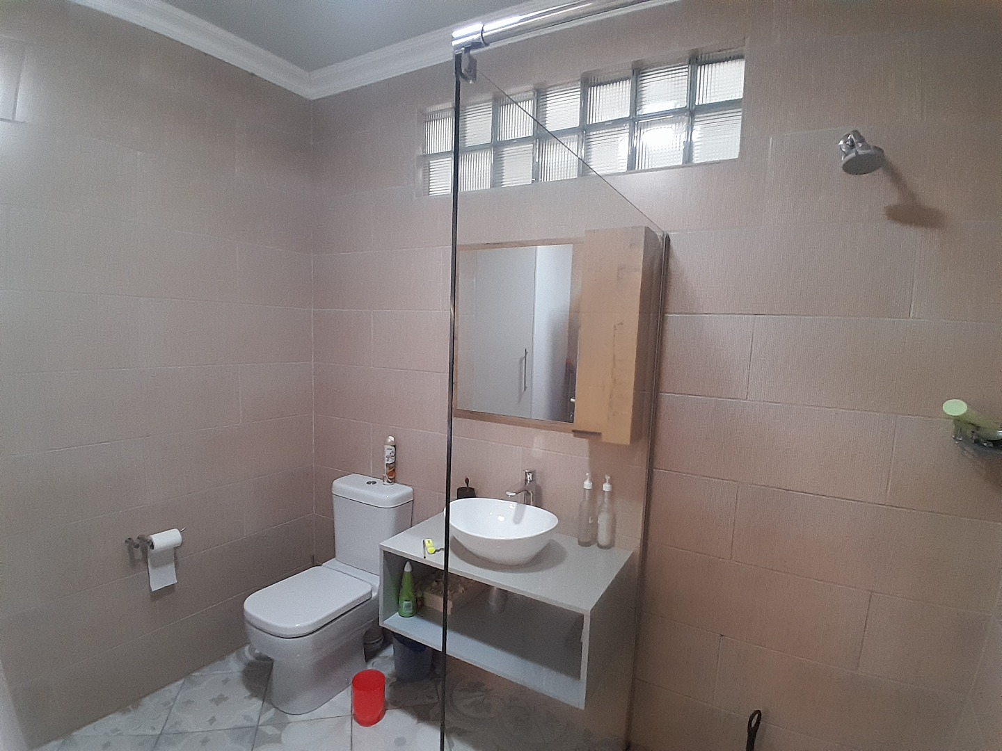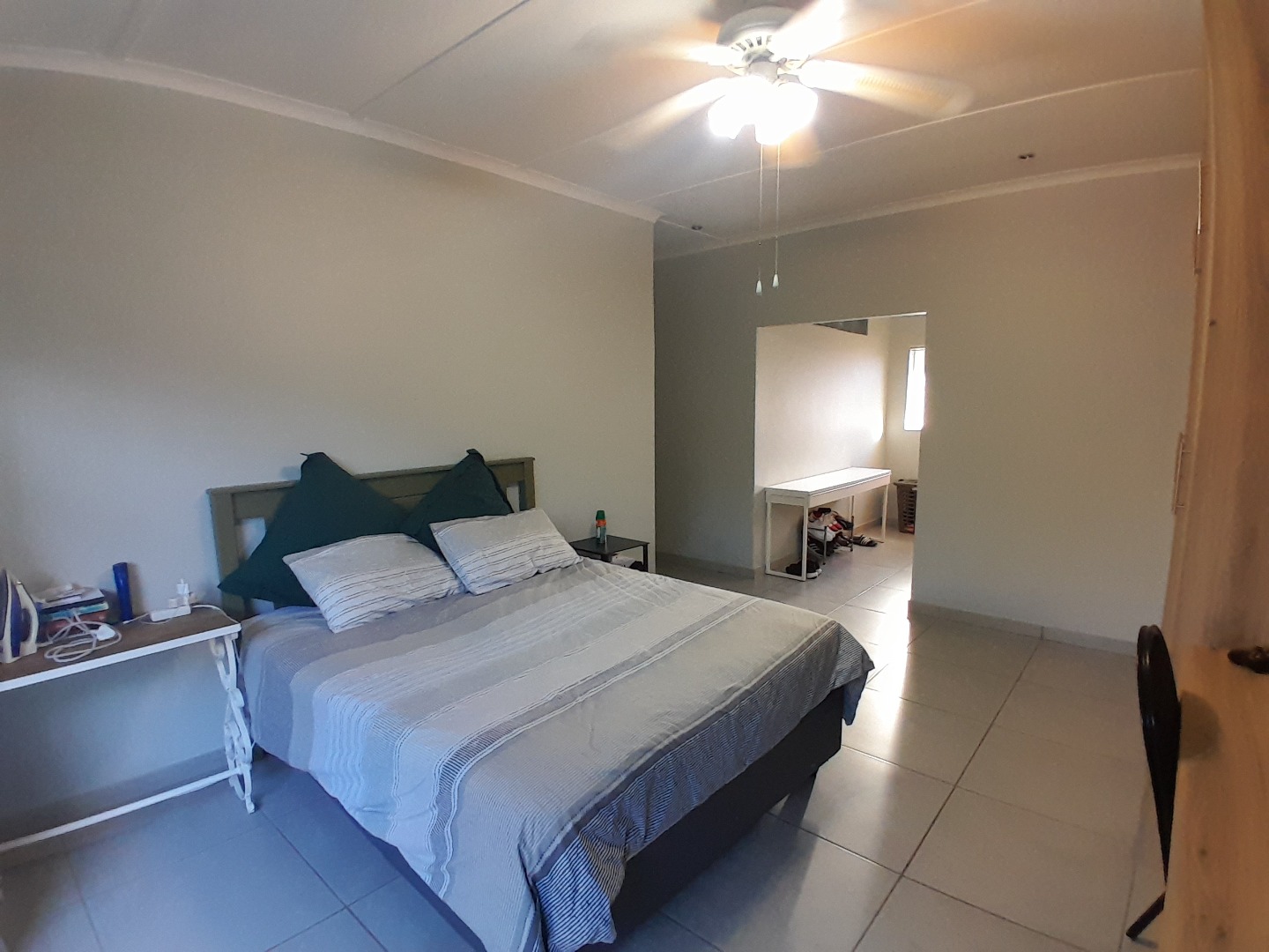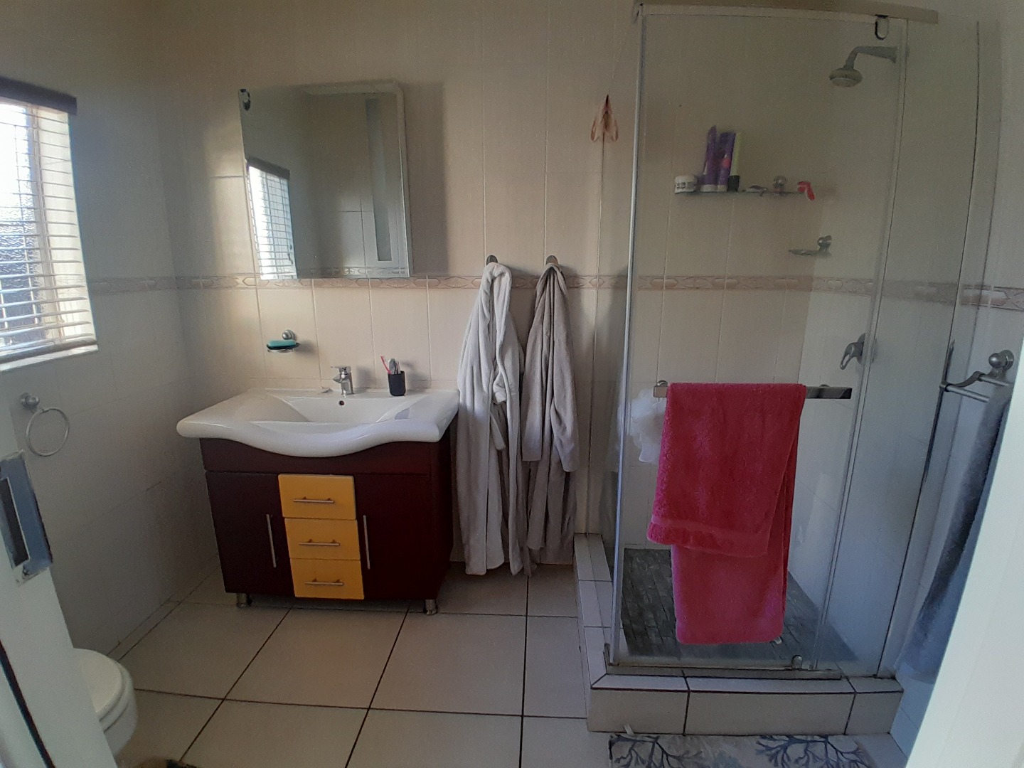 The modern open plan kitchen and lounge welcomes you into the property. The kitchen is equipped with a stove, microwave, fridge and washing machine. Cupboard space is not a problem. Air con.