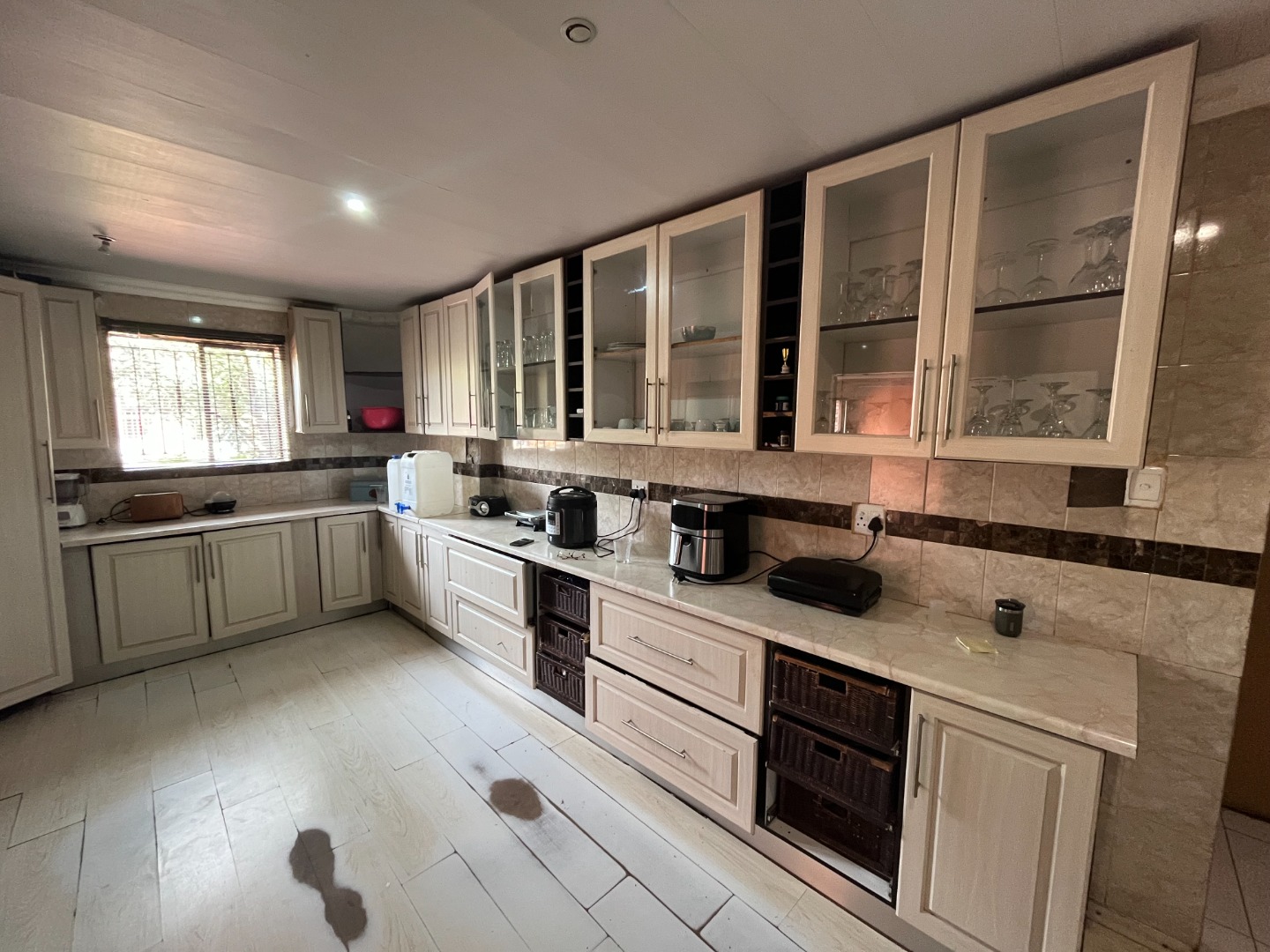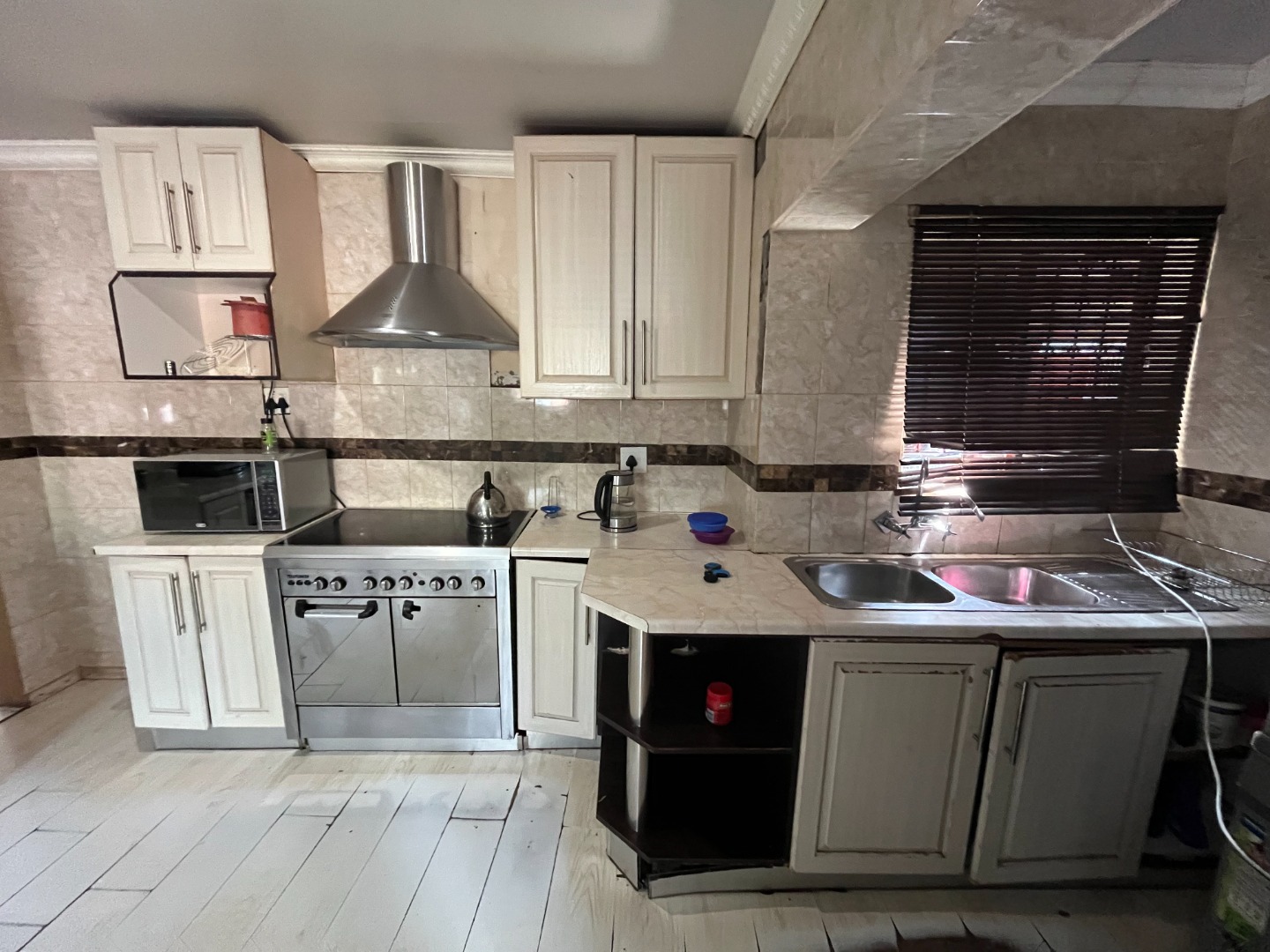 Kitchen with lots of cupboard space, gas stove and electric oven. Separate dining area and spacious lounge walking out on the sparkling swimming pool.